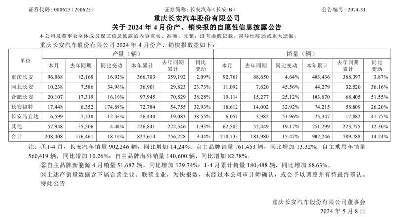 5月7日,長安汽車發(fā)布4月產銷快報稱,4月,長安汽車銷量達到21.01萬輛,同比增長15.47%;1-4月份,長安汽車累計銷量達到90萬輛,同比增長14.24%。