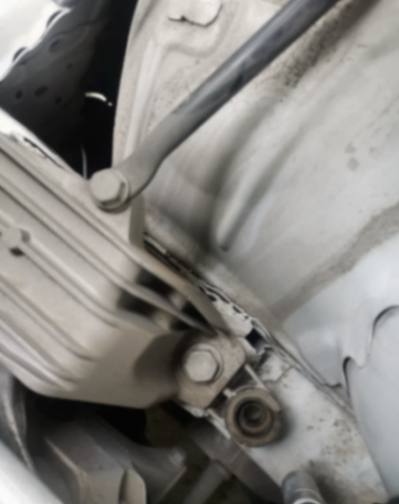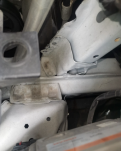 如上圖所示,這個位置是發動機的機腳,縱梁跟減震包連接的位置簡直跟狗啃的一樣!后焊接的痕跡簡直不要太明顯了!這種情況大概率是切割更換了縱梁,因為只有這里有問題,縱梁前端竟然是沒有變形。