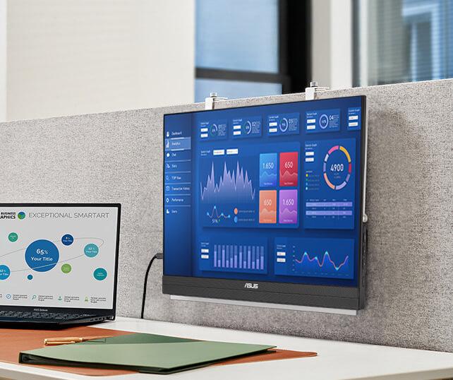 ZenScreen MB229CF 可移動顯示器包含一個可兼做握把的折疊支架,整體重量 2.2 千克;除利用自帶支架外,該顯示器還支持采用 C 型可調節夾持支架或是隔板掛鉤進行固定。