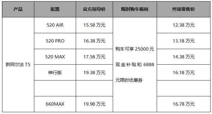 此外,新阿爾法T5現(xiàn)有車型也同步升級(jí)上市,并且加配不加價(jià)。為讓更多用戶感受“超閃充C級(jí)大空間SUV”的魅力,新阿爾法T5還將延續(xù)現(xiàn)款的限時(shí)優(yōu)惠政策,購(gòu)車用戶可享25000元現(xiàn)金補(bǔ)貼和6888元限時(shí)優(yōu)惠券,憑借此政策,新阿爾法T5實(shí)際到手價(jià)將降低至12.38萬(wàn)元起,擁有5C超充技術(shù)的神行版僅需16.18萬(wàn)元。不僅如此,置換客戶還可同時(shí)享受國(guó)家提供的20000元報(bào)廢換新補(bǔ)貼,或者各地方的置換補(bǔ)貼政策,進(jìn)一步拉低了消費(fèi)者享受高品質(zhì)家用純電SUV的門檻。