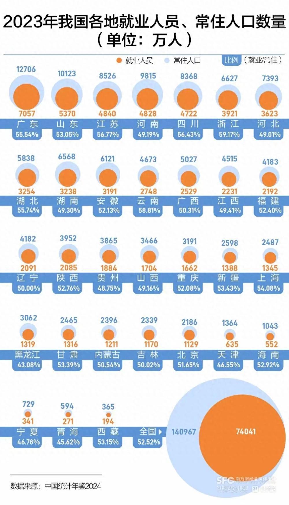 地域層面的就業格局更是耐人尋味。部分省份就業人員與常住人口的比例懸殊,像浙江這樣的地區,就業人員占常住人口比重高達 59.17%,彰顯出其勞動力市場的活力與吸引力;而河南盡管是就業大省,但這一比例僅為 49.19%,背后是人口流出的無奈現實。這種差異背后,是各地經濟發展模式、產業結構布局以及人口政策導向等多因素交織的結果。對于人口流出地而言,如何留住并吸引勞動年齡人口回流,成為重塑地方就業生態的關鍵;而人口流入地則需思考怎樣優化資源配置,避免因人口過度集聚引發的諸如住房緊張、公共服務壓力過大等“城市病”。