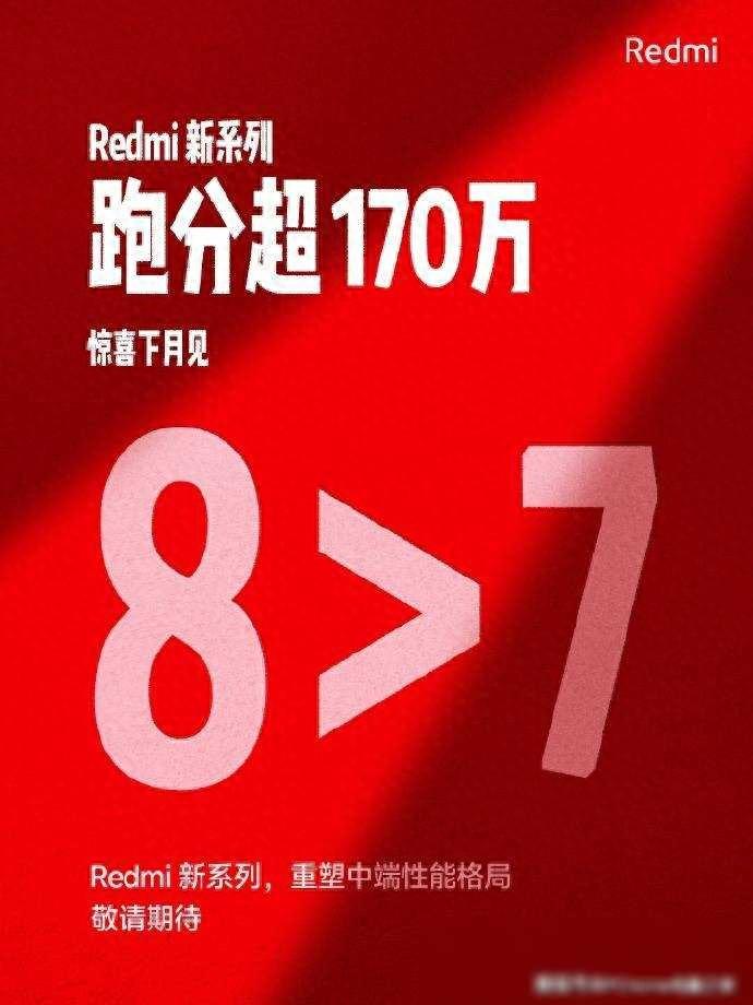 跑分超170萬的神秘新機,將在下個月正式與大家見面。讓我們一起期待,一起見證Redmi紅米帶來的科技奇跡!