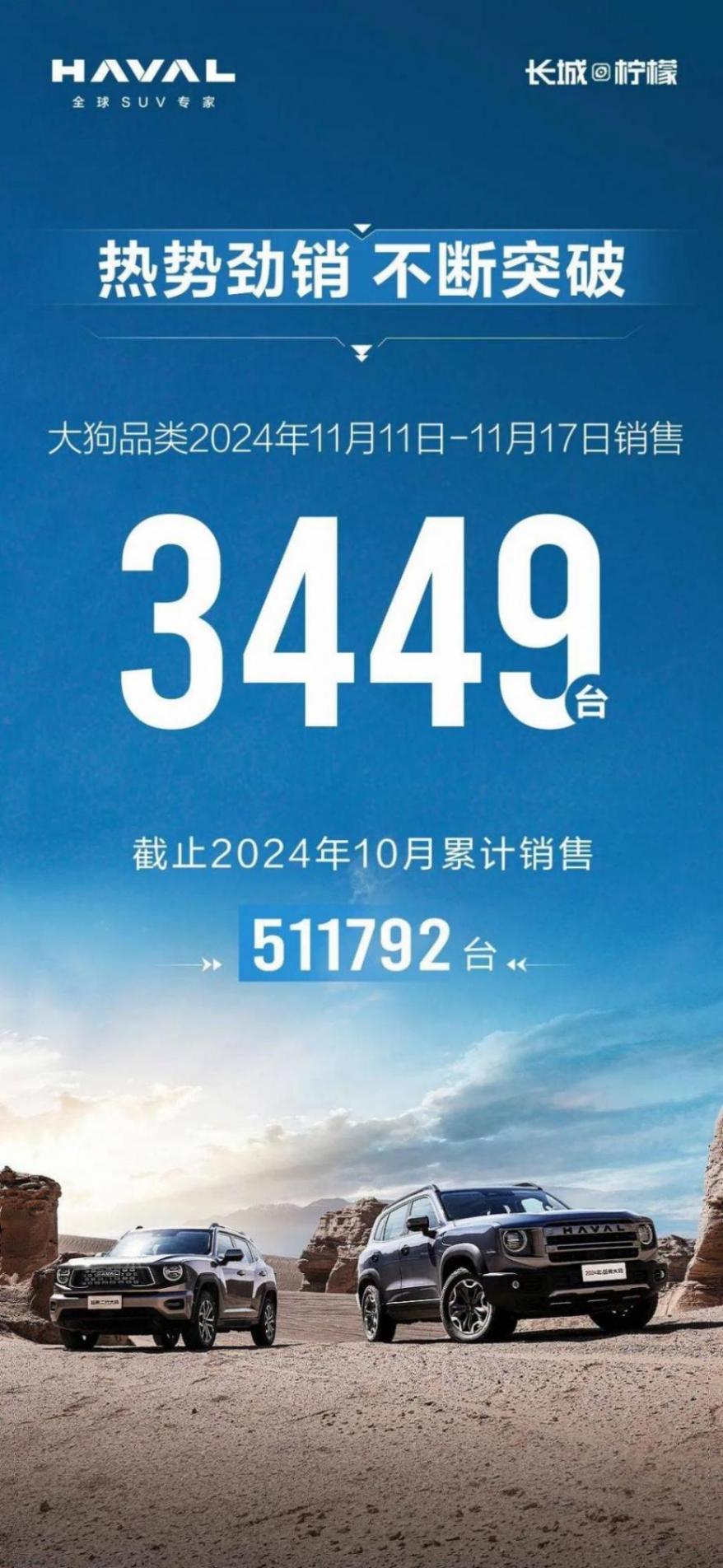 自2020年推出以來,哈弗大狗迅速圈粉。今年10月銷量達17,821臺,連續五個月銷量破萬,并呈現“五連漲”態勢,截至當月哈弗大狗累計銷量超51萬輛。值得注意的是,進入11月,哈弗大狗仍然維持火熱的銷售態勢,最近一周銷量達3449臺。強勁的表現,充分證明了泛越野市場的潛力,也印證了哈弗品牌的布局遠見。