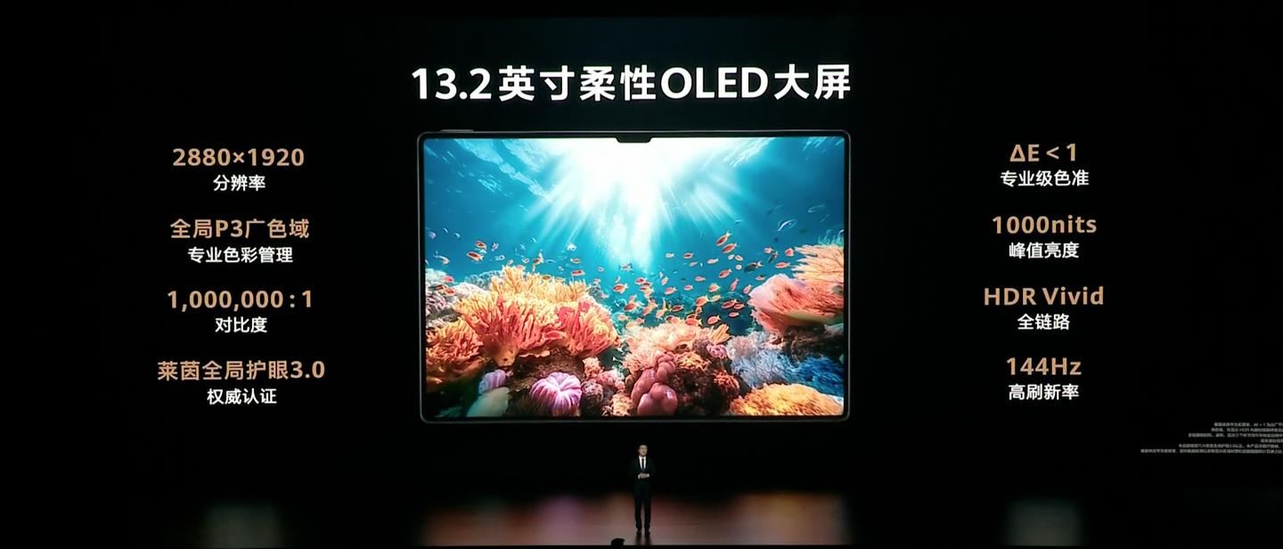 外觀方面,該機可選黑、白、金三種配色,正面采用一塊 13.2 英寸 2880x1920 分辨率 144Hz 柔性 OLED 劉海屏幕,配備云晰柔光技術,采用新型光學薄膜,讓文字銳利清晰,同時支持護眼模式、電紙書模式,機身支持側面指紋解鎖,內部配備立體導熱工藝。