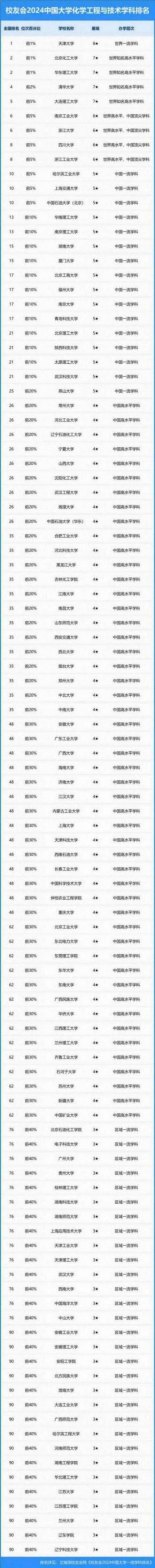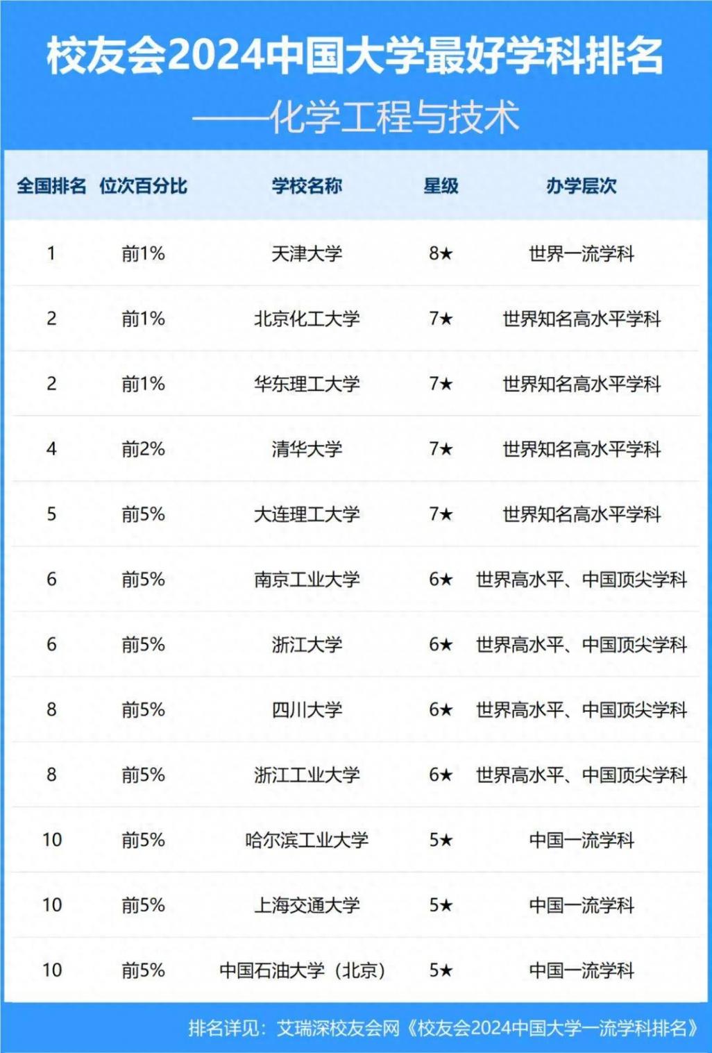 最新校友會2024中國大學化學工程與技術最好學科排名中,天津大學第1,北京化工大學、華東理工大學并列第2,清華大學第4,大連理工大學第5