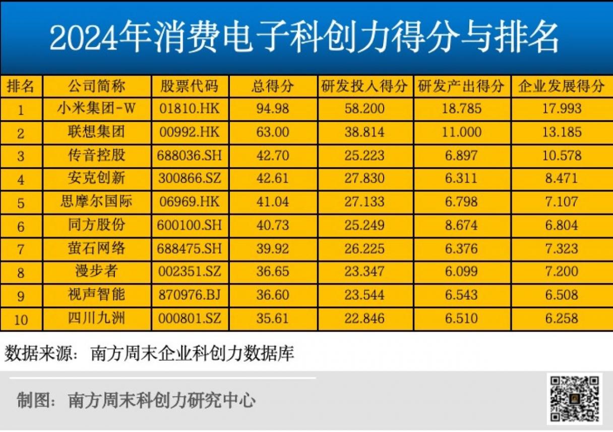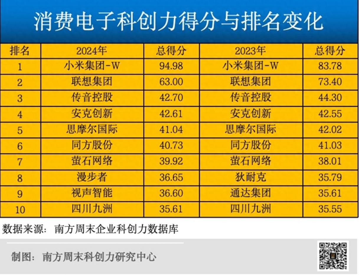 得分和排名結果顯示,本次前十的企業中有八家的排名與2023年榜單保持一致。其中,小米集團(01810.HK)與聯想集團(00992.HK)的分差,從上一年度的10分擴大至30分。此外,漫步者(002351.SZ)、視聲智能(870976.BJ)成為新晉上榜企業。