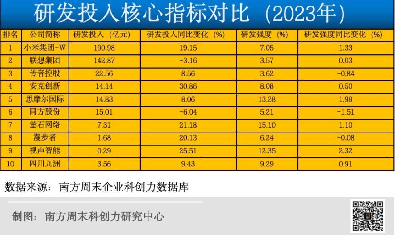 2023年,聯想的研發投入為142.87億元,研發強度為3.57%,兩個指標及變動幅度均不及小米。因此,在權重最高的研發投入維度,小米集團以58.2的得分大幅領先于聯想的38.814分,僅此一項就拉開20分的差距,這是兩者分差的核心原因。