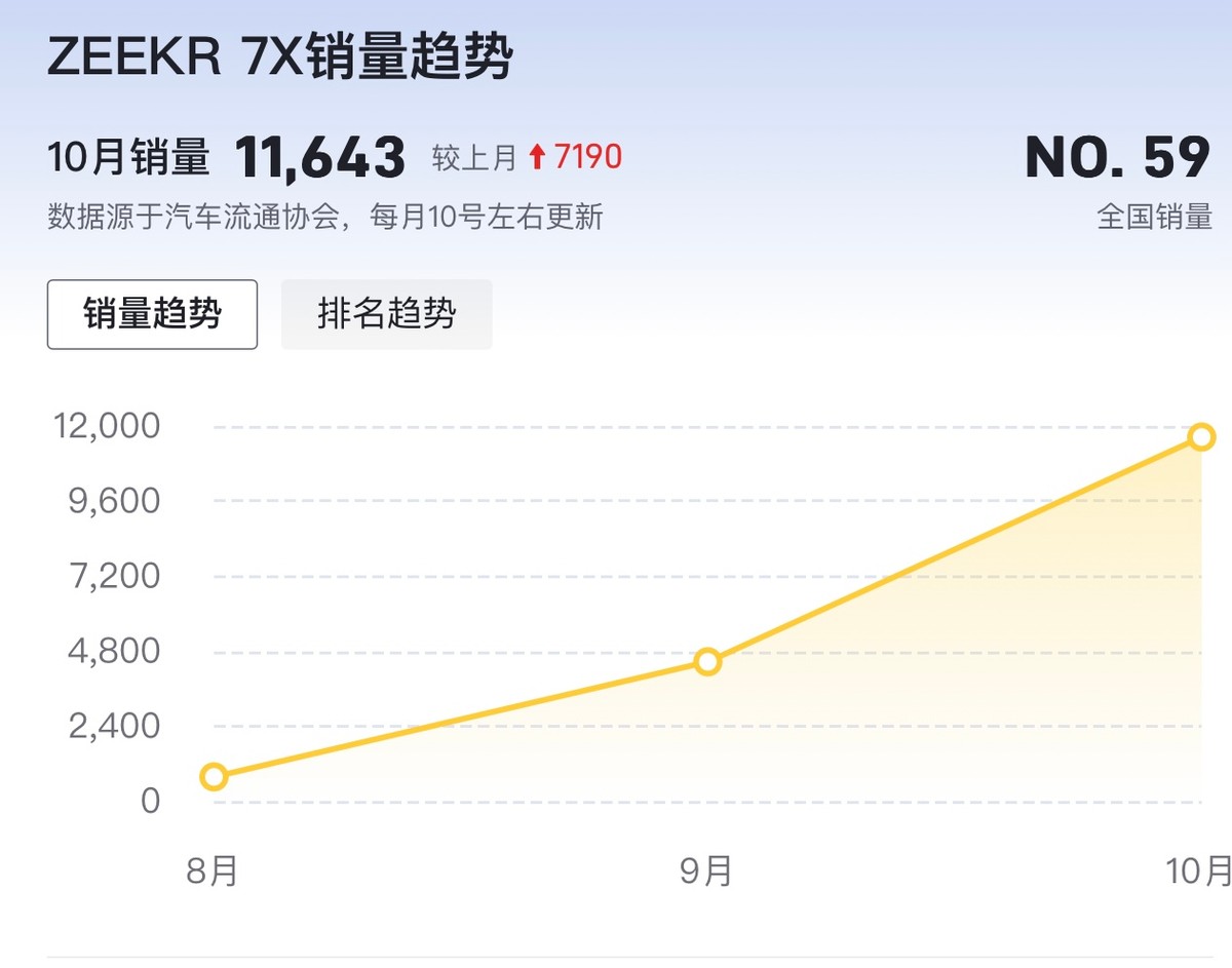 極氪7X備貨量比較大,配置高,用料也不錯,9月份當月已經交付4453輛,10月份交付11643輛,這個確實可以稱為爆款,