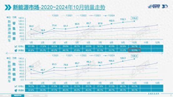 根據(jù)乘聯(lián)會的數(shù)據(jù),在2024年1月,新能源汽車滲透率為32.8%,到了10月份,新能源汽車的滲透率已經(jīng)達到了52.9%。