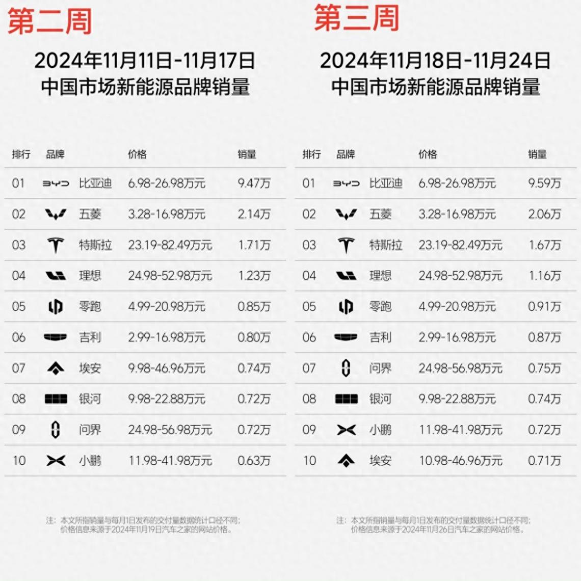 11月26日,國內乘用車市場部分車企品牌本月第三個完整周(11月18日-11月24日)銷量出爐。從數據來看,大部分新能源汽車品牌銷量都實現了“穩中有進”。從排名來看,在新能源汽車品牌、高端車品牌以及自主新勢力品牌陣營,比亞迪、特斯拉以及理想汽車仍分別位居各榜單銷量第一。
