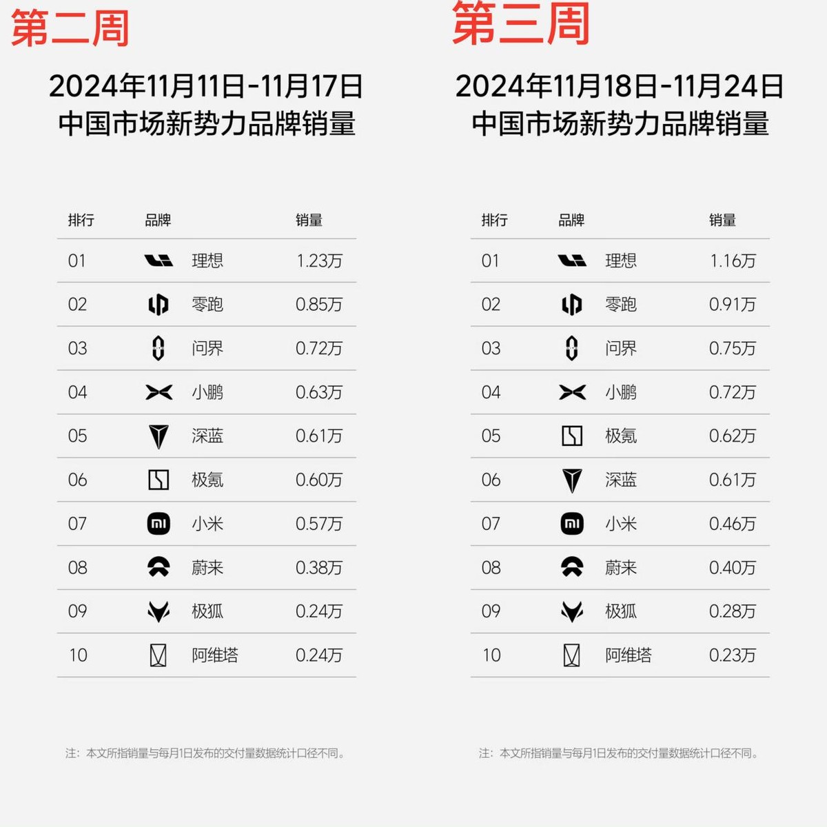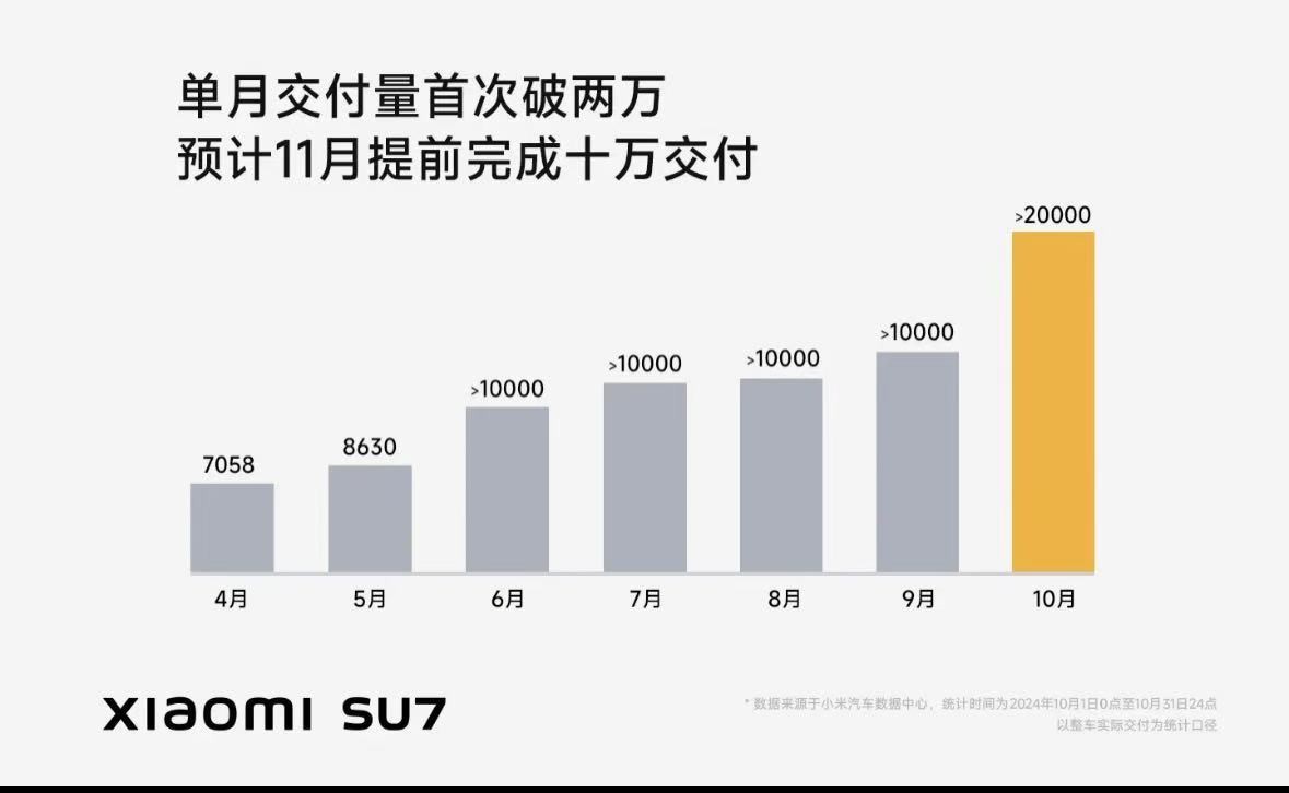 在新勢力榜單中,值得關注的還有小米汽車。相比于大部分車企逐周增長的勢頭,小米汽車本月第三周卻略有下滑,周銷量為0.46萬輛。10月份,小米汽車首次月銷量超過2萬臺,本月,小米汽車將提前完成年銷量10萬輛的目標。