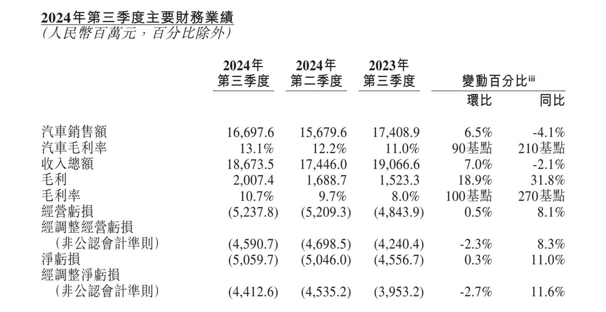 根據蔚來汽車最近公布的2024年第三季財報,其總營收為186.735億元,同比下降2.1%,而汽車銷售額則為166.976億元,同比下降4.1%,經營狀況并不算很理想。此外,蔚來汽車凈虧損已達到50.597億元,同比增長8.1%,依舊保持巨額虧損的狀態,今年累計虧損已超過150億元。