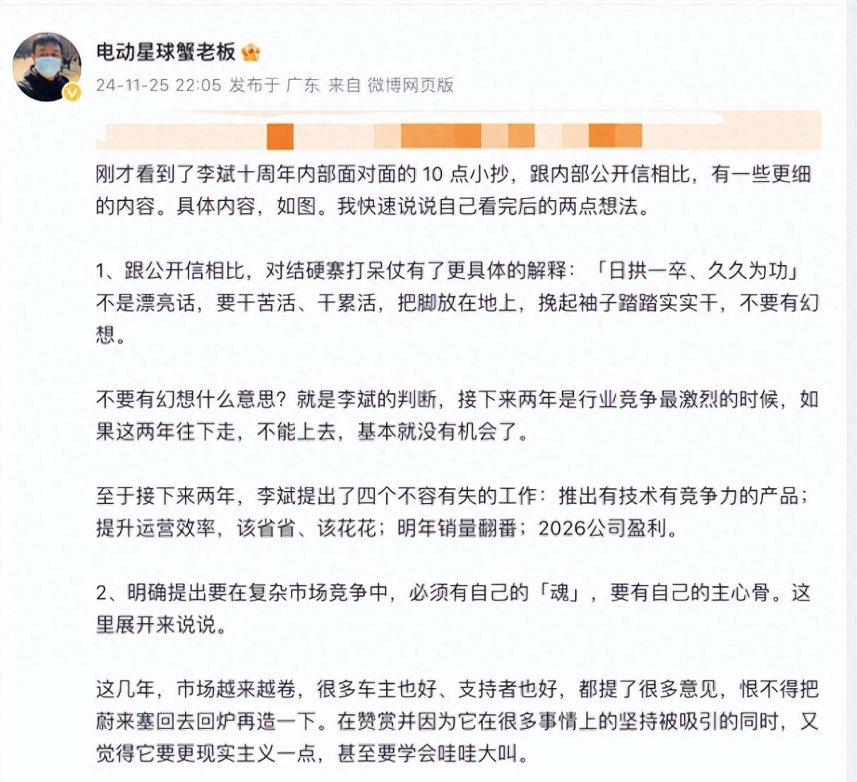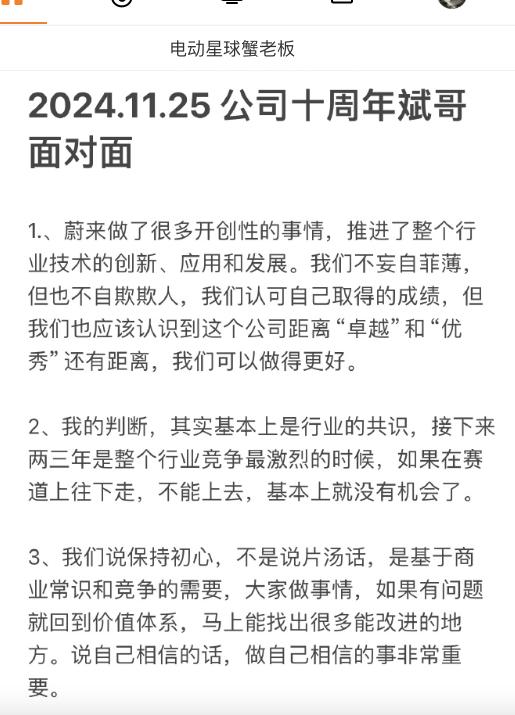 網(wǎng)上刷到,李斌在蔚來十周年員工面對面中提了4個工作任務(wù)