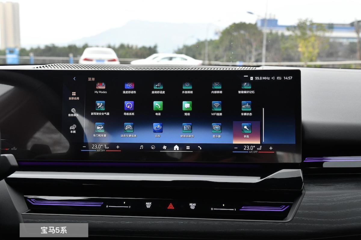 兩款車雖然都通過換代強化了座艙內(nèi)的科技氛圍,也都是偏向于豪華的裝飾版本,但寶馬5系這邊明顯會顯得更“輕盈”且更富運動感一些,12.3+14.9英寸雙聯(lián)屏帶有曲面效果,而雙輻式異型方向盤很有運動賽車的感覺,懸浮的換擋機構(gòu)中也提供了電子撥片換擋與iDrive多媒體控制器,從屏幕的極窄邊到軟包的撞色,再到小尺寸的功能結(jié)構(gòu),它怎么看怎么都是一股子青春氣息。