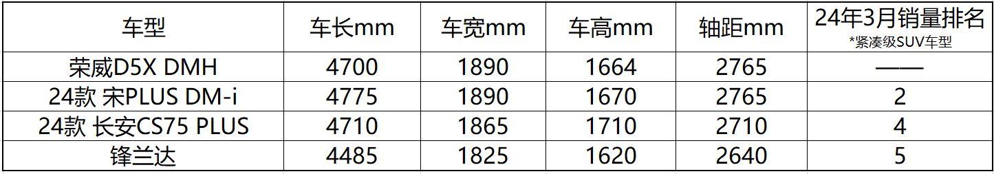 之所以說這款車適合自駕出行,關鍵還是在于榮威D5X DMH這臺車的空間表現蠻不錯,該車長寬高為為4700x1890x1664mm,軸距2765mm,定位一臺緊湊型SUV,車身尺寸在同級別中屬于偏大類型。下表是相比目前市面上暢銷的幾款同級SUV的尺寸,可以看出榮威D5X DMH這樣的車身尺寸,在同級別的SUV當中空間雖不算出眾,不過也算是達到了主流水平。