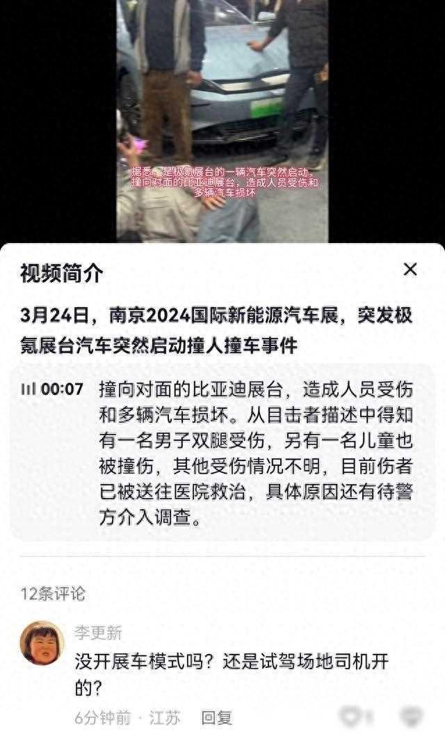 截至目前,南京2024國際新能源汽車展上發生的意外事件仍然引發著廣泛熱議。一輛極氪汽車在展臺上猛撞比亞迪展示車輛,導致多輛車損壞和觀眾受傷。現場嘈雜混亂,畫面令人心驚。盡管警方尚未公布調查結果,但大多數人猜測,此次事故源于一名觀眾操作失誤以及展示車輛狀態未正確設置。