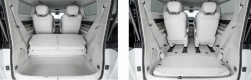 所以,新車提供了3/6/8座車型,并且8座版車型的第四排座椅靠背可折疊在座椅坐墊上,靠背折疊后,座椅可整體向后翻轉至行李區后部底盤向下凹陷中。