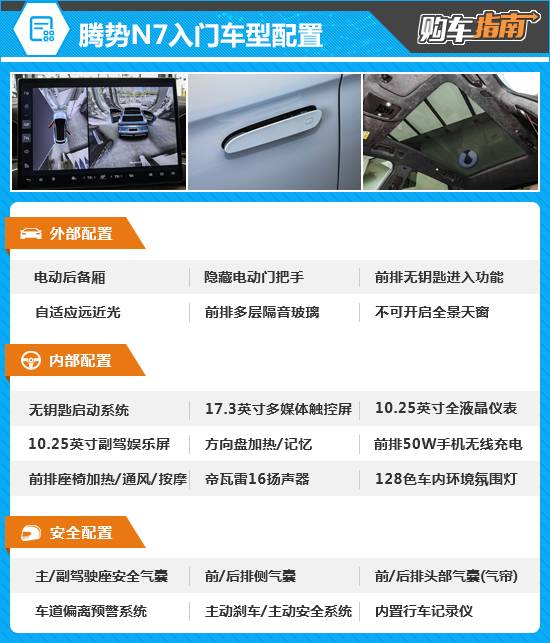 2024款騰勢N7的入門車型配置表現非常豐富,不僅舒適性和便利性配置樣樣俱全,就連主/被動安全功能也直接拉滿。而之所以此次沒有推薦,主要原因在于續航里程,如果作為家里唯一的一輛車或者主力出行工具,亦或是家里沒有條件安裝充電樁,那么550km的純電續航里程確實差點意思。