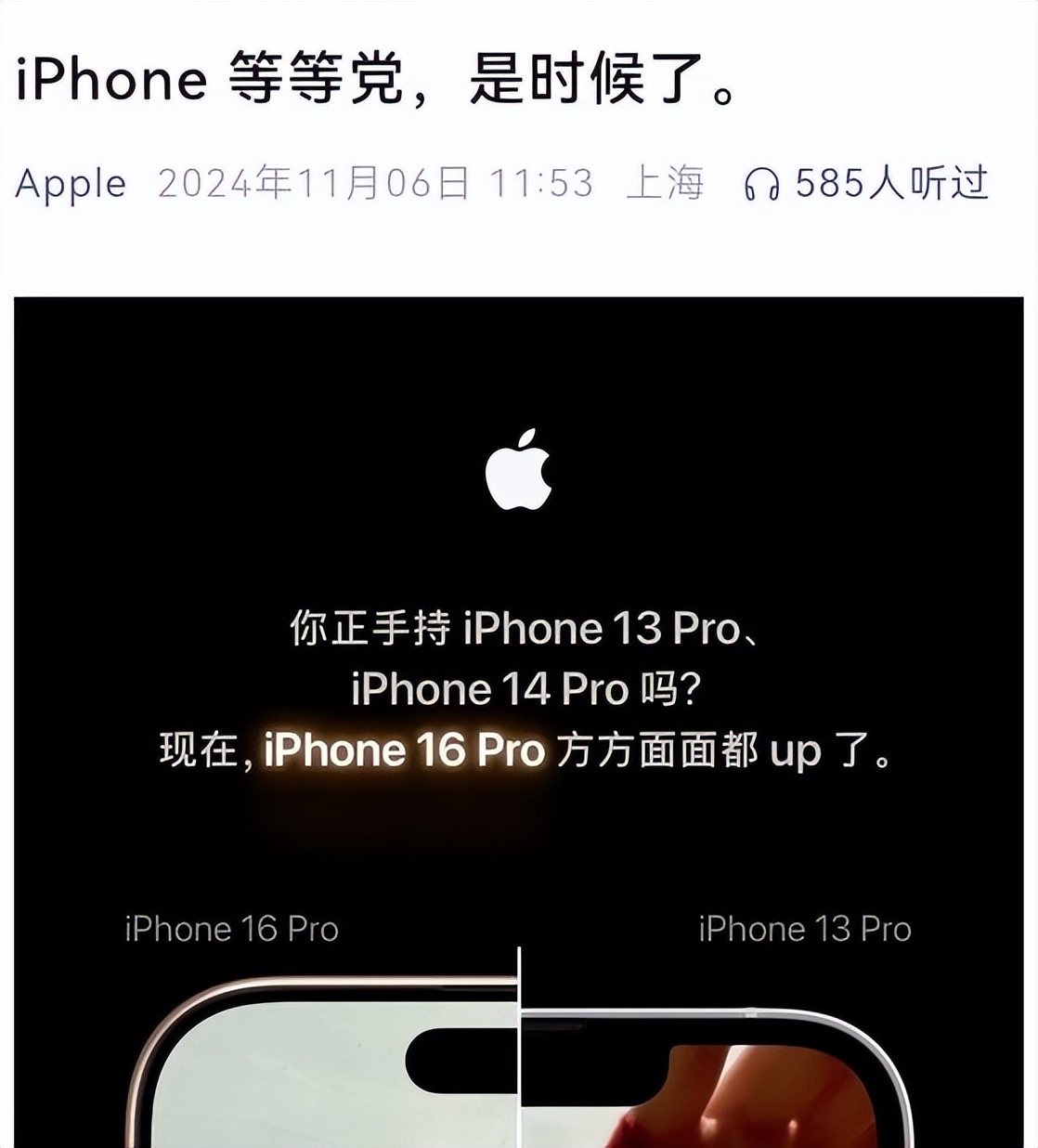 這一幕在全國各地的蘋果專賣店不斷上演。隨著iPhone16系列的發布,蘋果官方罕見地發文《iPhone等等黨,是時候了》,直指iPhone13 Pro和14 Pro用戶該升級換代了。