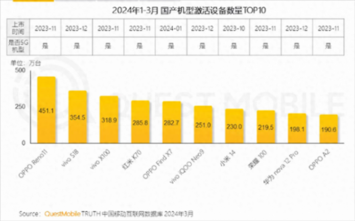 QuestMobile日前公布了《2024中國移動互聯網春季大報告》,報告數據顯示,2024年1-3月份國產機型激活設備數量TOP 10中,OPPO Reno11、vivo S18以及vivo X100位列前三位,前十中OPPO與vivo均有三款機型上榜。