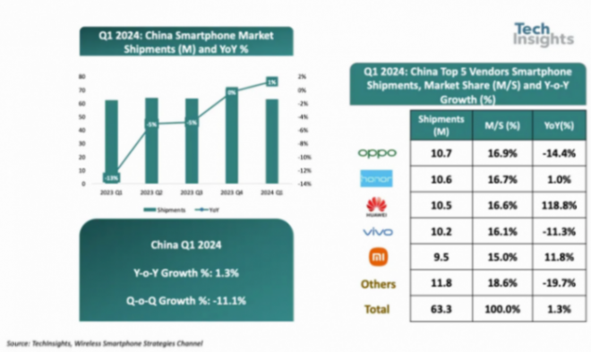 得益于OPPO Reno11的熱銷,也助力OPPO在2024年第—季度的出貨量問鼎中國智能手機市場首位。據TechInsights發布的數據,2024年第—季度OPPO(含一加)的市場份額達到了16.9%,二到五位分別是榮耀、華為、vivo以及小米。
