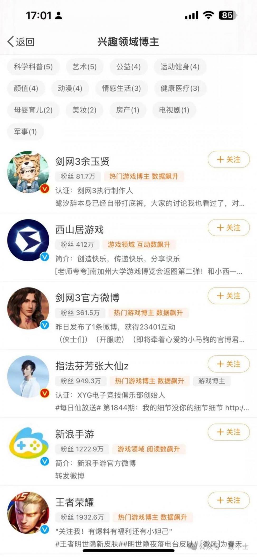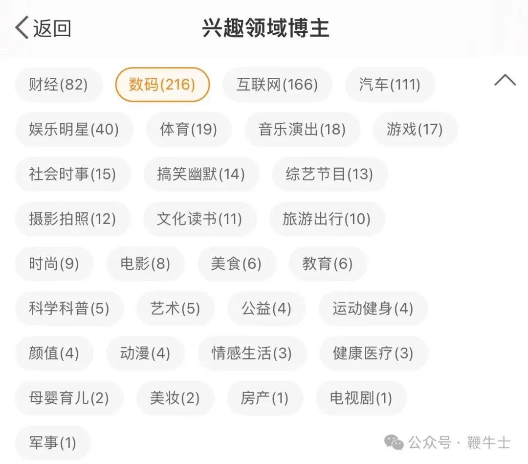 雷軍微博共關注1535人,其中多為數碼、互聯網、汽車、財經行業博主。