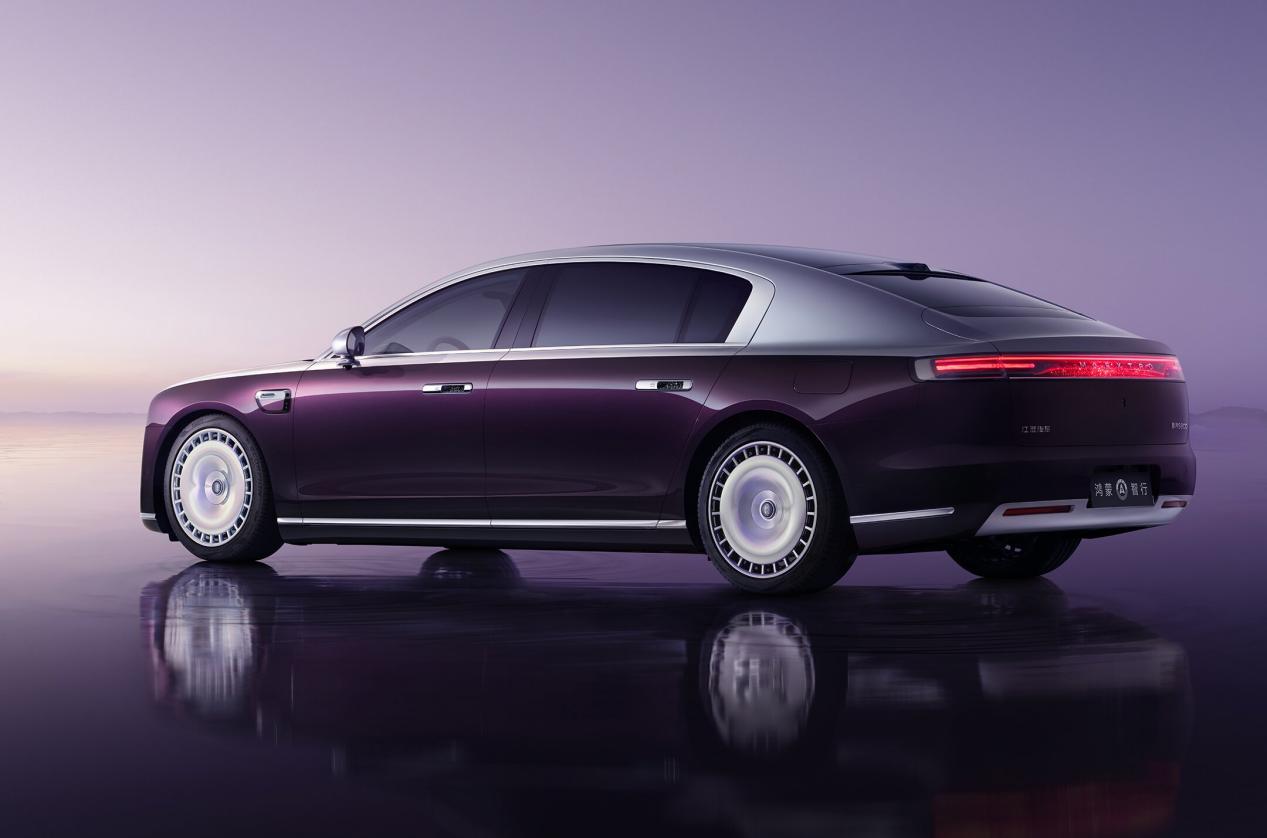 從官圖來看,尊界S800采用紫色和銀色組成的雙色車身提升氣場。B柱和C柱趨近垂直,配合龐大的身材,將會營造商務人士偏愛的穩重氣息。尊界S800據說還會有“摘星”門把手,采用半隱藏式門把手,運用星河造型光源體現人車交互的特點。做工精致的21英寸大餅輪轂非常奪目,將豪車氣質拿捏。