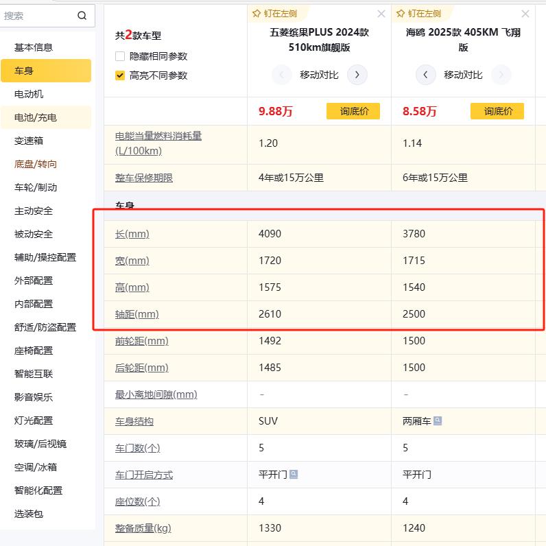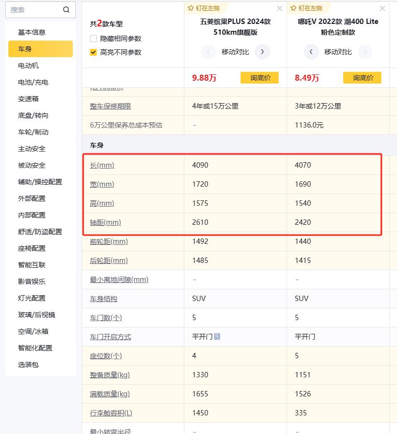 此外,與定位為小型SUV的同級競品車型哪吒V相比,五菱繽果SUV同樣表現優越。哪吒V的車身尺寸為長4070mm、寬1690mm、高1540mm,軸距為2420mm。從數據對比中可以看出,五菱繽果SUV在車寬和軸距方面均優于哪吒V,這進一步證明了其在空間方面的優勢。