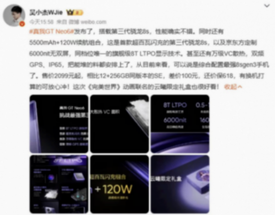 同樣知名博主@吳小杰WJie 也是對真我GT Neo6系列那一系列旗艦配置給予了很高的認可。畢竟在硬件上此次真我GT Neo6也為我們帶來了全新的第三代驍龍8S芯片,憑借不俗的性能、功耗以及溫控表現也是完全能夠滿足我們在各類場景下的用機需求。不僅如此,針對用戶需求,真我GT Neo6系列在續航方面也為我們帶來了5500mAh超大容量電池+120W光速秒充的組合規格,搭配萬級VC散熱、雙頻GPS、IP65等一系列細節配置也是完美貼合了每一位用戶的使用需求。