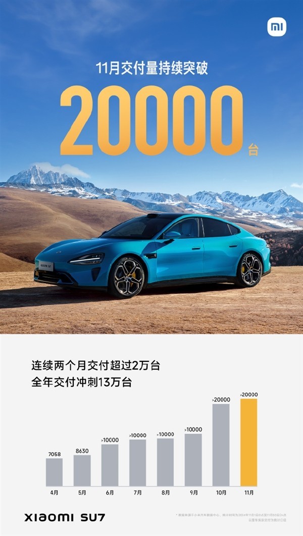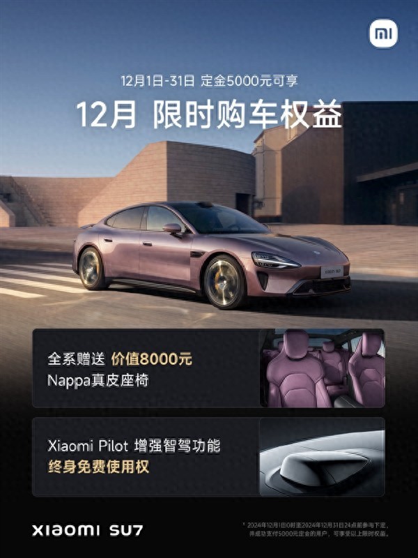 小米汽車宣布,2024年11月,小米SU7交付量繼續(xù)超20000臺,對達(dá)成全年超過13萬臺的新交付目標(biāo)充滿信心 。官方還公布了12月限時購車權(quán)益,12月1日至31日,下定全系可享受: