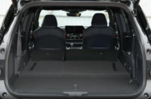 至于后備廂方面:豐田皇冠陸放在第三排座椅打開的情況下,依然能夠豎著放下四個登機箱以及其他一些雜物,滿足一家短途出游沒有,而放倒了第三排座椅之后,裝載空間就完全不成問題了。通過圖片就可以看出第二排和第三排座椅放倒之后可以與后備廂形成一個純平地臺。