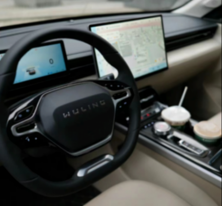 進入車內,整體的視覺感受則是燃油汽車的設計風格,雙輻式方向盤造型美觀,并且上方覆蓋著亮黑色的飾板,視覺效果不錯。前方液晶儀表盤小巧,并且帶有梯形設計,造型還是挺洋氣的。