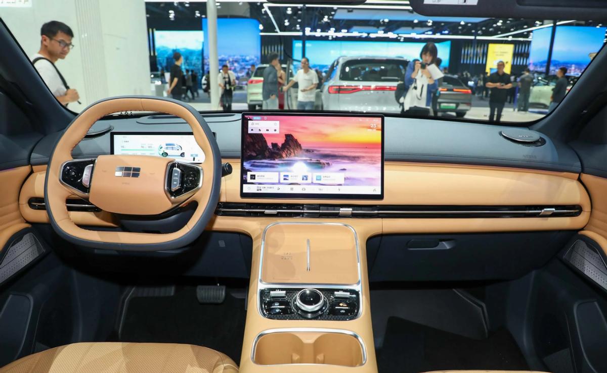 進入車內,銀河星艦7 EM-i的中控布局與銀河E5比較接近,充滿了平直的線條,而且配合上貫穿式的氛圍燈帶,會覺得座艙比較舒展,10.2英寸的儀表屏+14.6英寸的中控屏組合,也比銀河L7的三塊屏幕看上去清爽一些。