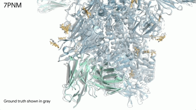 如圖所示,AlphaFold 3 對 7PNM(藍色部分)與抗體(綠色部分)、單糖(黃色部分)相互作用時的結構預測,與真實結構(灰色部分)吻合。