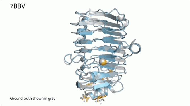 AlphaFold 的預測結果,包含一個酶蛋白(藍色部分)、一個離子(黃色球體)和一些單糖(黃色部分),契合了真實結構(灰色部分)。