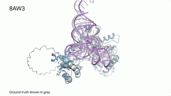 類似地,AlphaFold 3 預測了一個由蛋白質(藍色部分)、RNA 鏈(紫色部分)和兩個離子(黃色部分)組成的分子復合物,同樣和真實結構(灰色部分)高度匹配。