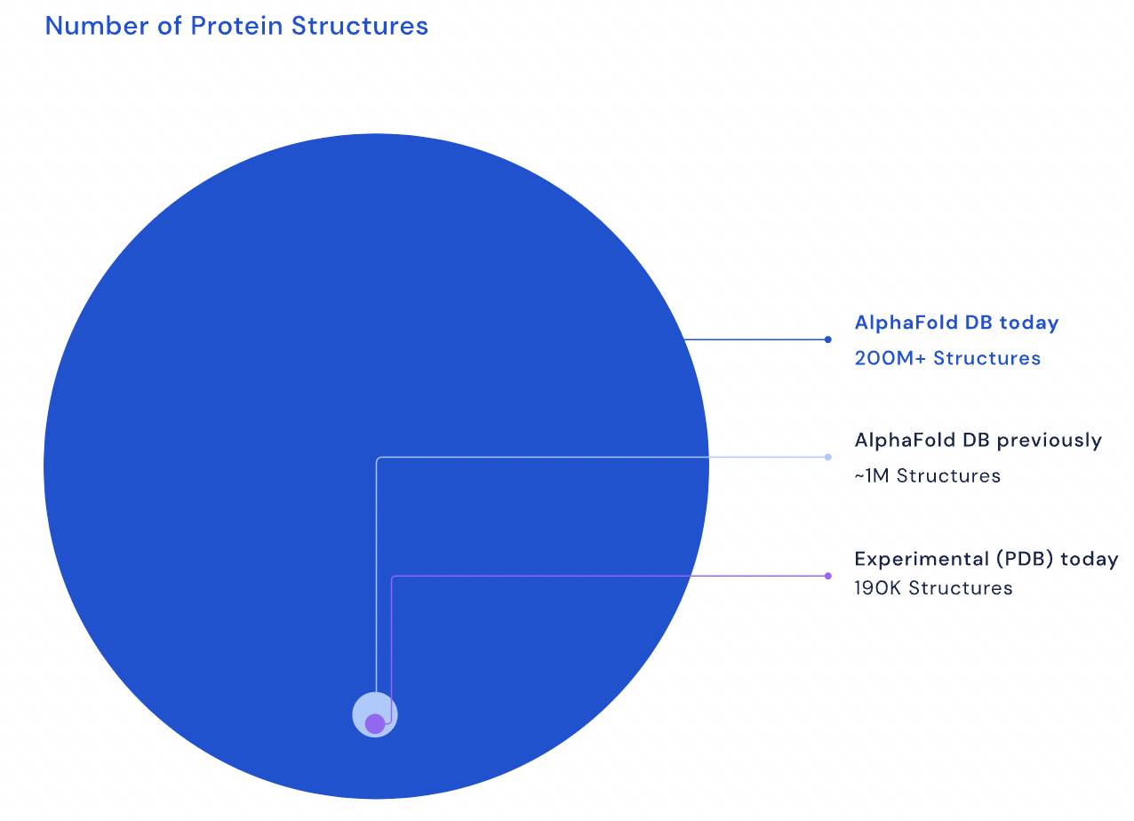 2022 年 7 月,DeepMind 發布了幾乎所有科學已知的蛋白質預測結構,總共超過 2 億個,除了人類,其中還包括了植物、細菌、動物和其他生物體的預測結構。