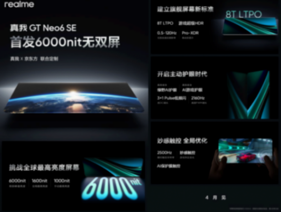 從相關內容來看,真我GT Neo6 SE的這款屏幕由真我和京東方聯合定制,1.5K分辨率,其局部峰值亮度會來到6000nit,印象中這是目前量產機型里面峰值亮度最高的產品,不過其全局峰值亮度只有1600nit,手動亮度則是10nit。