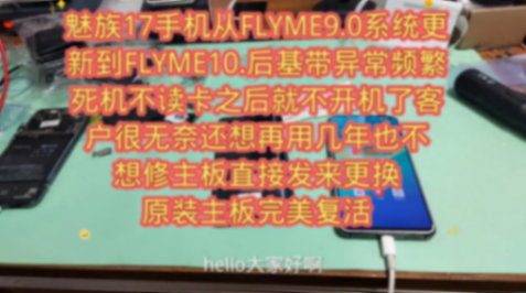 hello大家好,給你們更新一臺魅族17,這臺是17度灰的手機,這個手機的故障就是從FLYME9.0升級升到FLYME10.0,更完以后就出現(xiàn)極大異常,極大異常就是不讀卡,就是沒信號手機,后面就頻繁死機不讀卡,最后就不開機了。