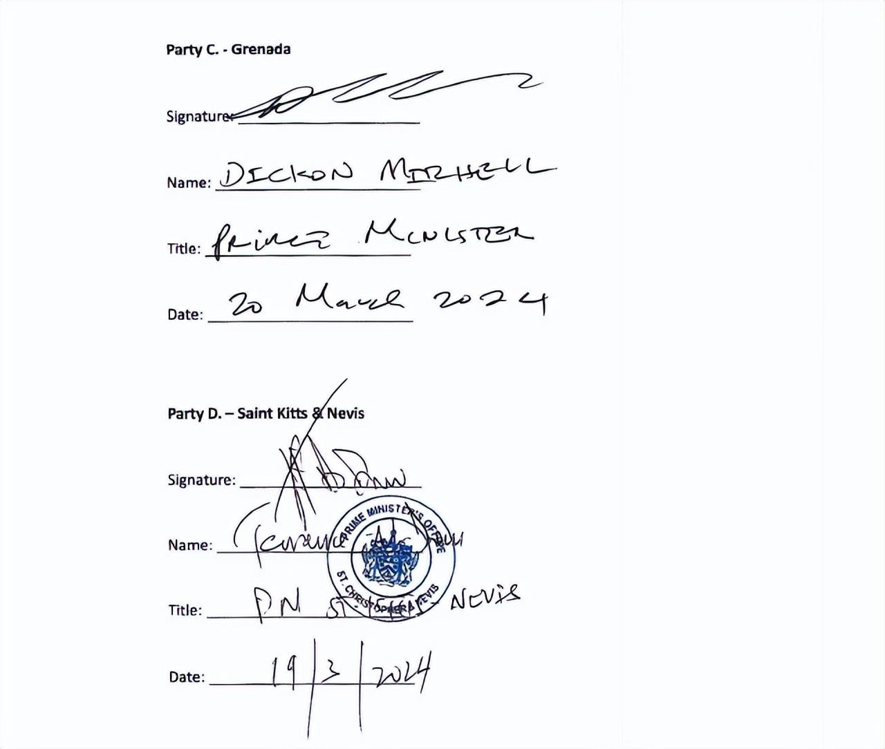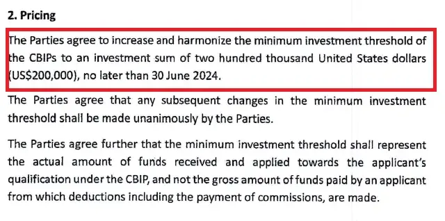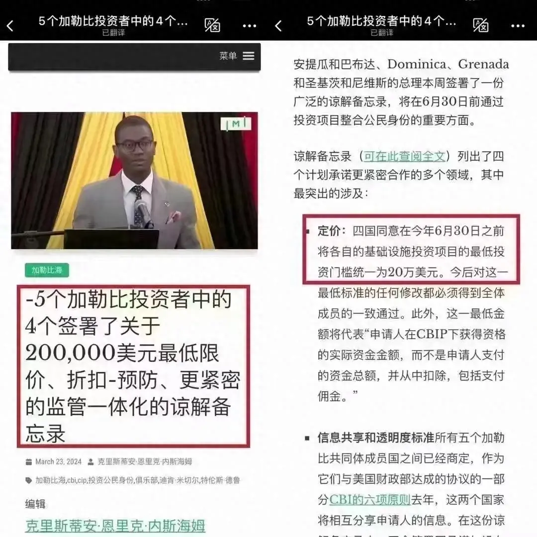 3月20日,加勒比四國集體簽署漲價協議,安提瓜和巴布達、圣基茨和尼維斯、多米尼克、格林納達四國總理簽署了一份備忘錄,宣布四國將于2024年6月30日前統一改革投資入籍護照項目,其中最重要的一個變化是最低捐款額將統一調高至20萬美元。