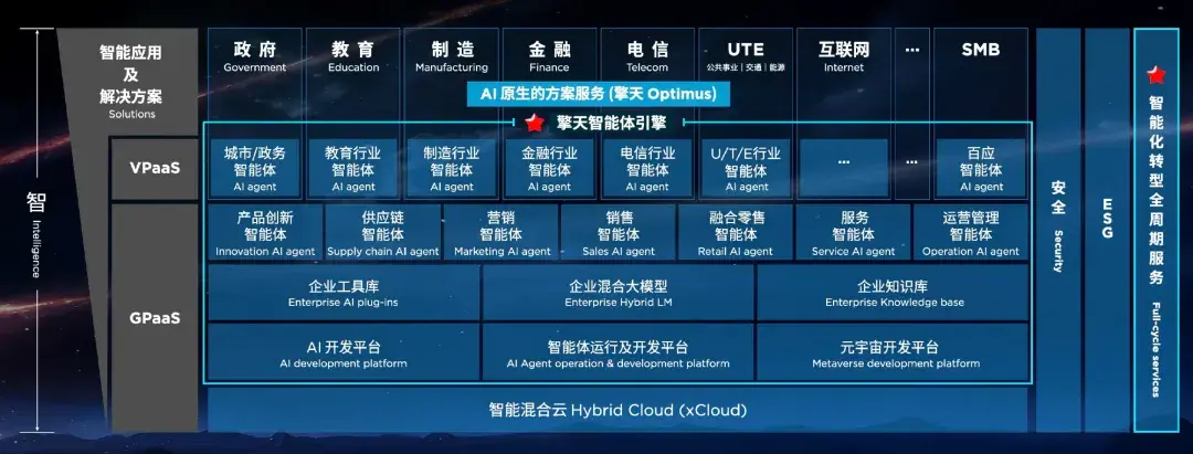 隨著AI技術的日益成熟,人工智能將從技術突破,逐步邁入落地應用的新階段。在強大的服務體系支撐下,方案服務以擎天智能體引擎為客戶落地AI應用的重要抓手,圍繞政企、中小企業(yè)及消費三大客群,打造全棧智能化轉(zhuǎn)型全周期服務,與千行百業(yè)一道擁抱智能化時代。