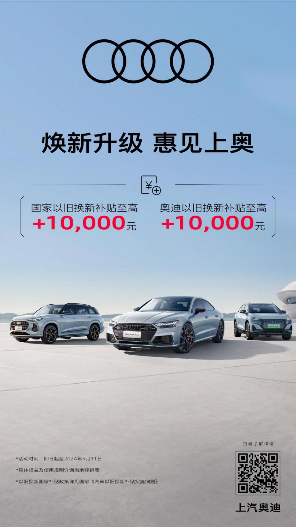 5 月 10 日消息,上汽奧迪宣布即日起至 5 月 31 日推出限時購車優惠政策,涉及奧迪 A7L、奧迪 Q6、奧迪 Q5 e-tron 等車型,包括以舊換新最高補貼 1 萬元,國家以舊換新最高補貼 1 萬元。