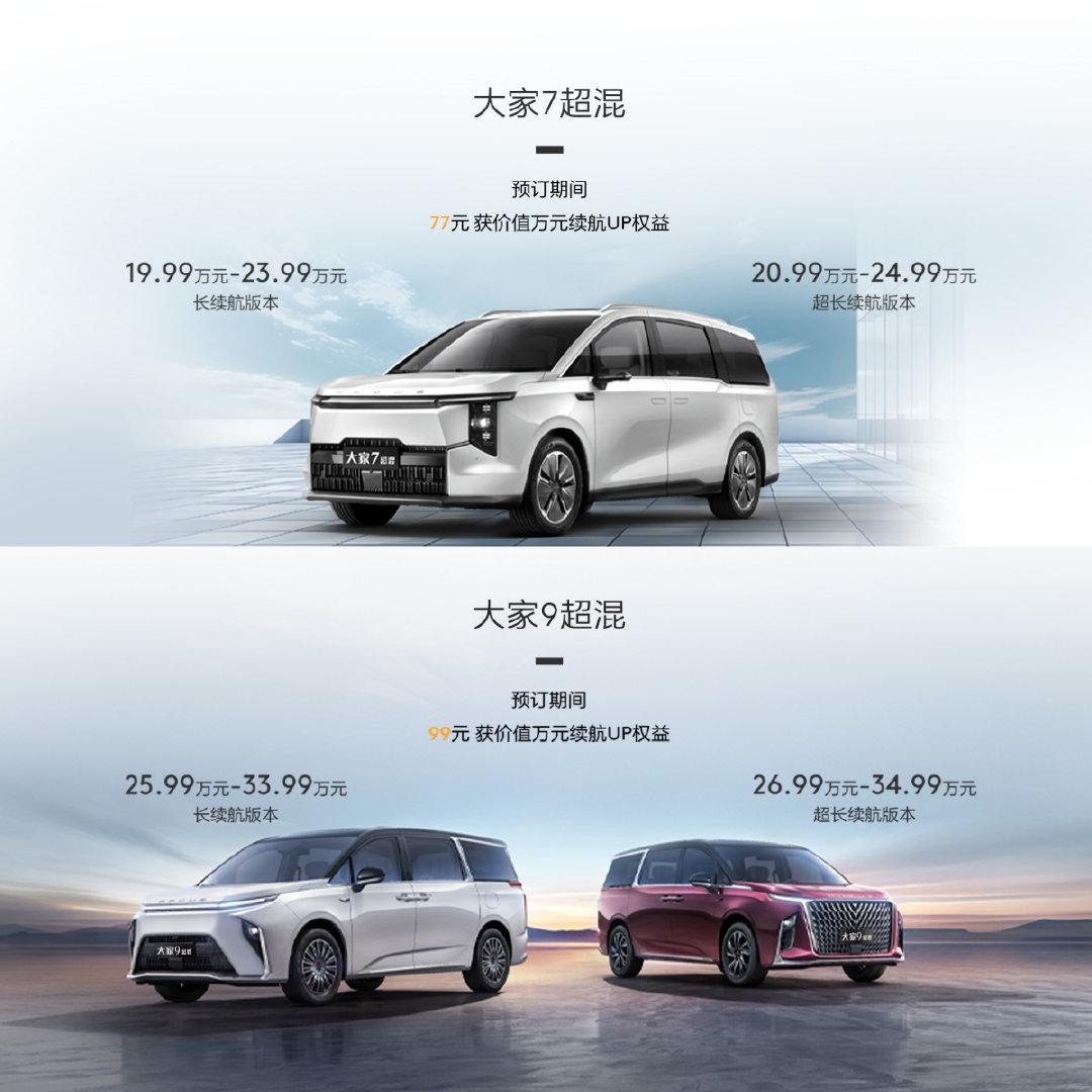 目前兩款車都已經開啟了預訂,大家9超混預訂價25.99萬元-34.99萬元;大家7超混預訂價19.99萬元-24.99萬元。感興趣的朋友完全可以入手一輛,相信絕對不會讓你失望。