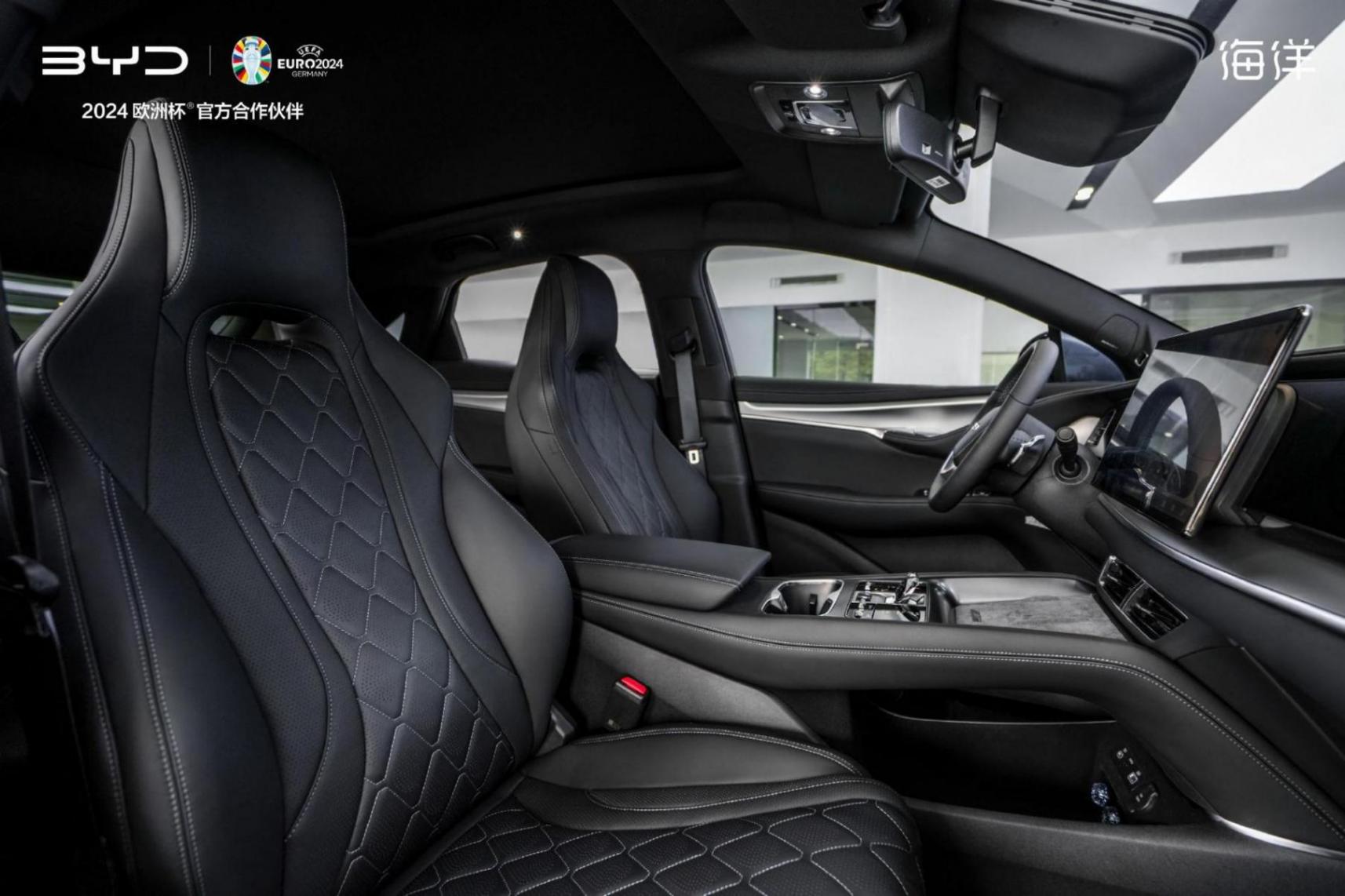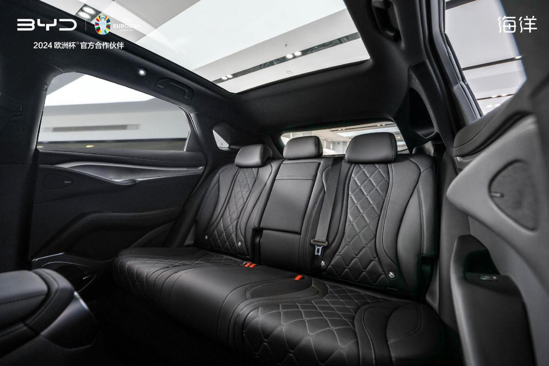 在外觀方面,新車在前臉部分采用了海洋家族標志性的設計語言,彎鉤狀的大燈組梯形下格柵霧燈區進氣道都顯得相當的運動。車身側面溜背轎跑式線條,流暢的車頂過渡,明顯下墜的C柱懸浮式車頂大尺寸氣動輪轂隱藏式車門把手都沒有缺席。在車尾部分,貫穿式的尾燈也是明顯的海洋網絡家族風格,與海豹DM-i一致,車頂大尺寸擾流板,尾箱蓋末端處小尾翼也顯得相當的運動。