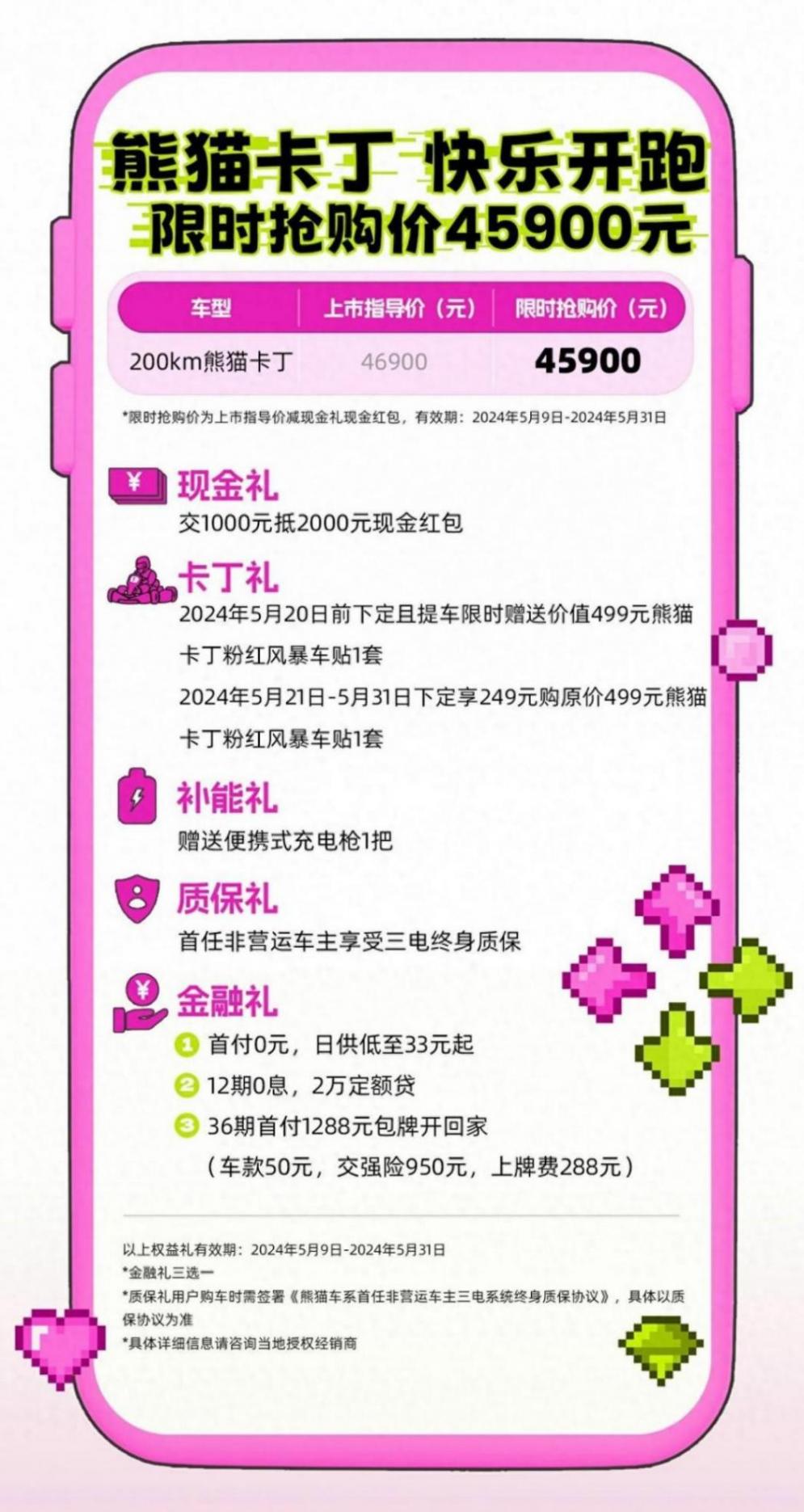 近日,吉利熊貓最新一版衍生車型熊貓卡丁正式上市,新車當然只有一個配置一個款式,售價為4.69萬元,還有現金限時優惠,搶購價是4.59萬元。