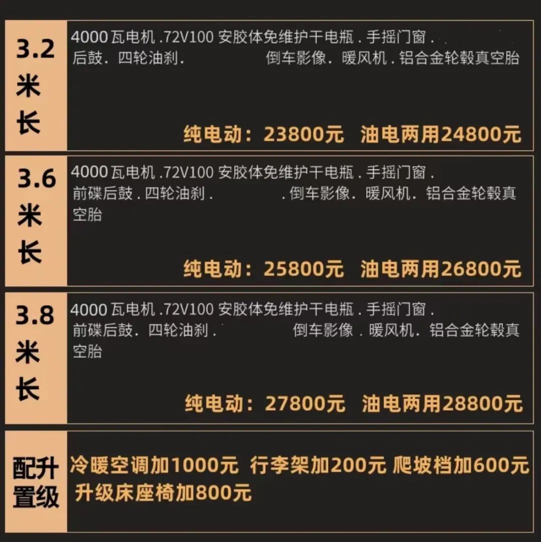 最基礎(chǔ)款3.2米長,純電動,23800元;頂配3.8米車長,油電兩用,28800元(沒錯,居然只要加1000就可以升級成混動)。
