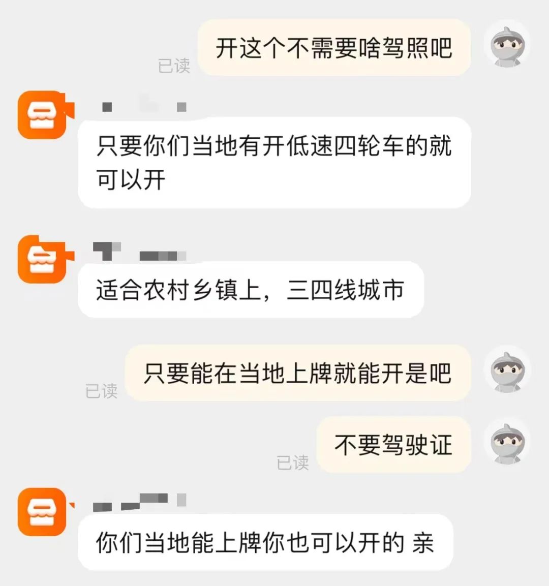 客服表示:這輛車適合在三四線城市和農(nóng)村鄉(xiāng)鎮(zhèn);只要當?shù)赜虚_低速四輪車的就可以開,能上牌就可以開。
