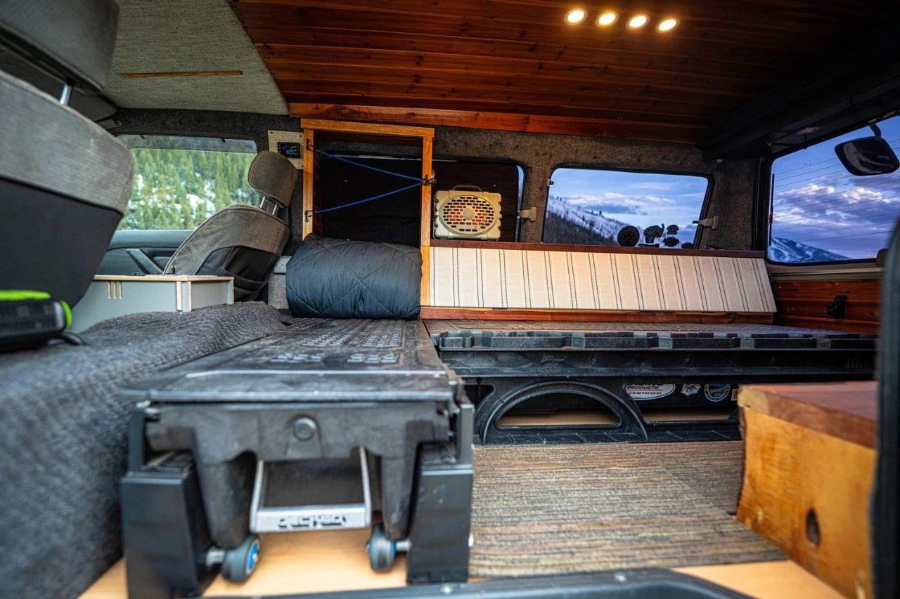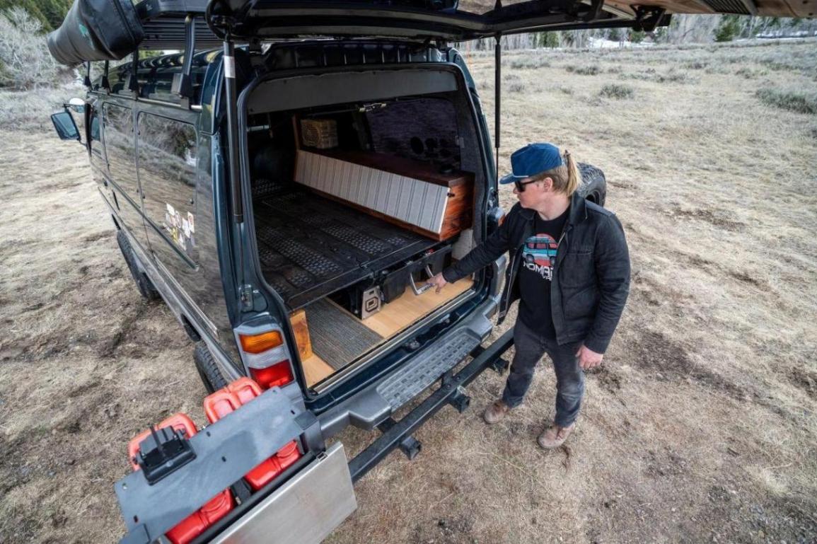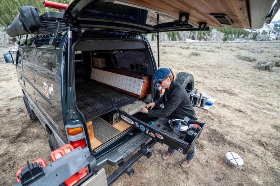 車內使用了兩個巨大的“抽屜”,一橫一豎放置在車內。后部的豎抽屜帶有較大的翻轉面板,可以在儲物的同時變身為一張床。除此之外,在底部還能向后滑動,在停車之余可變身成為儲物盒和廚房,里面放置了平底鍋、盤子、置物架、Aeropress咖啡機等。