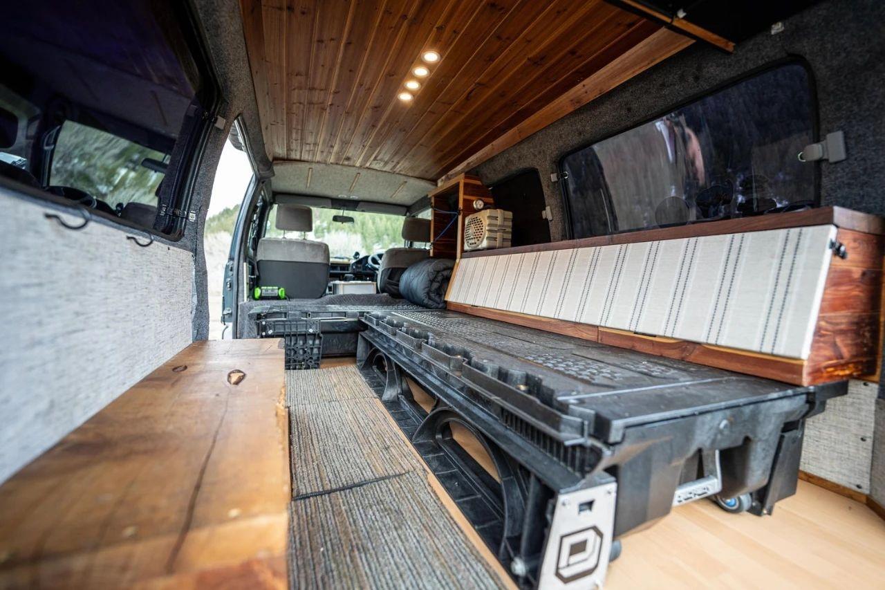 在乘客座位的后面是橫抽屜,Nomadic Van Life在里面放置了帶泵的充氣床墊以及睡袋。