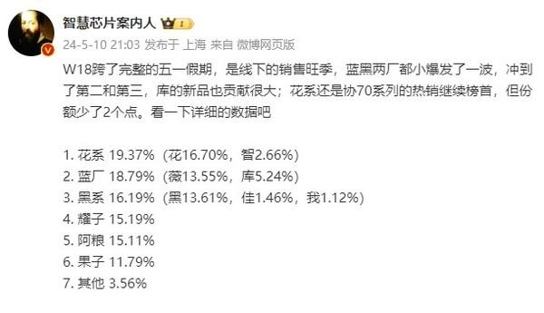該博主分析稱,W18跨了完整的五一假期,是線下的銷售旺季。從廠商的表現來看,vivo和OPPO兩大廠都小爆發了一波,沖到了第二和第三,iQOO的新品對銷量的貢獻也很大。此外,華為品牌這邊,Pura 70系列持續熱銷,助力華為繼續占據榜首,但份額相比上周少了2個百分點。